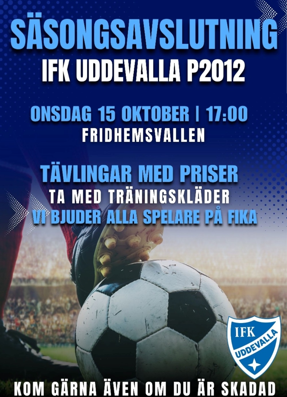 På onsdag 15/10 kommer IFK-Uddevalla P2012 ha säsongsavslutning klockan 17:00. Alla som varit en del av laget under säsongen är välkoma. Vi kommer köra olika tävlingar och ha prisutdelning. Vi bjuder alla spelare i laget på fika.