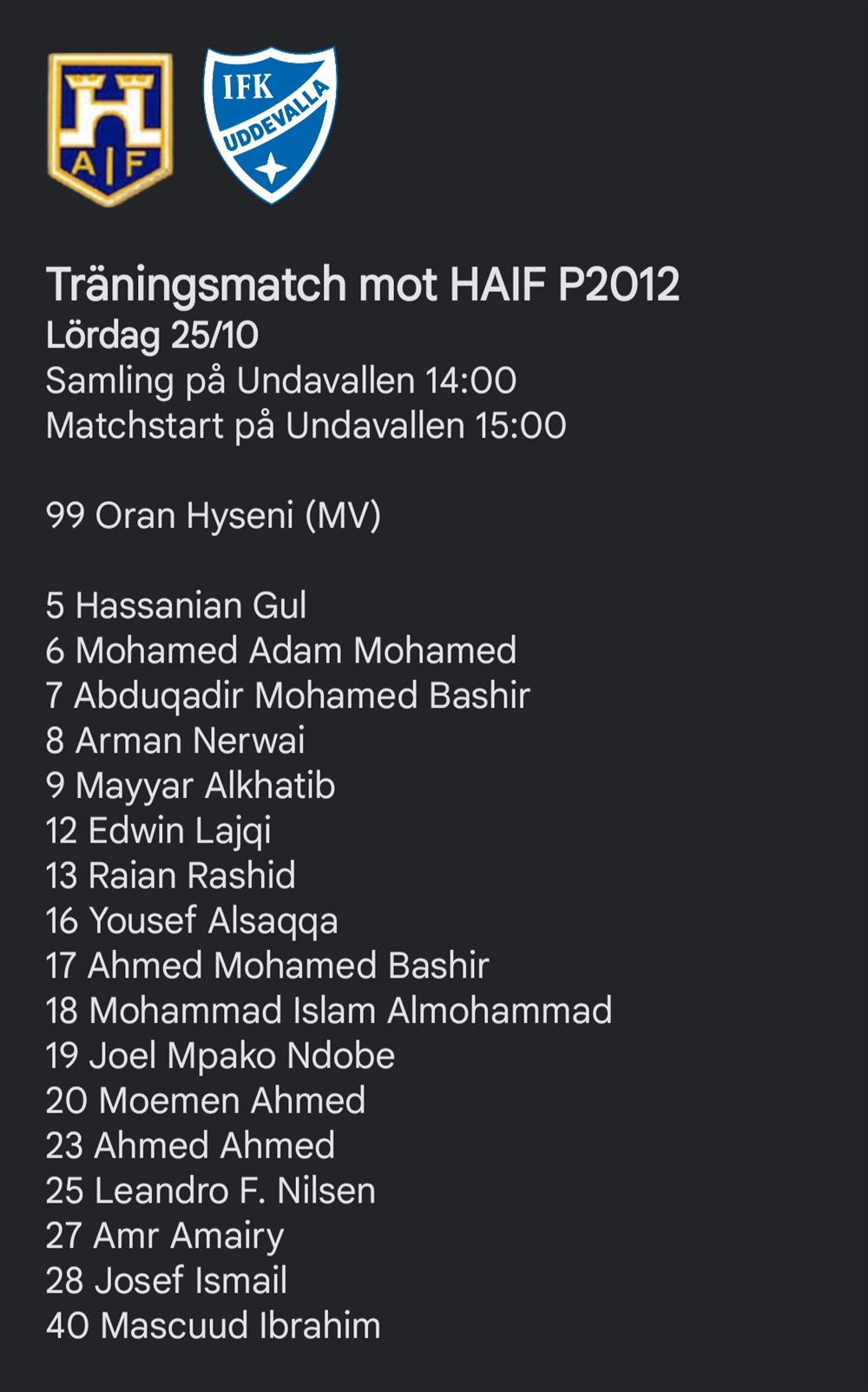 Samtliga spelare är uttagna till träningsmatchen men alla kommer tyvärr inte erbjudas lika mycket speltid. Det beror på prestation på träningar det senaste.