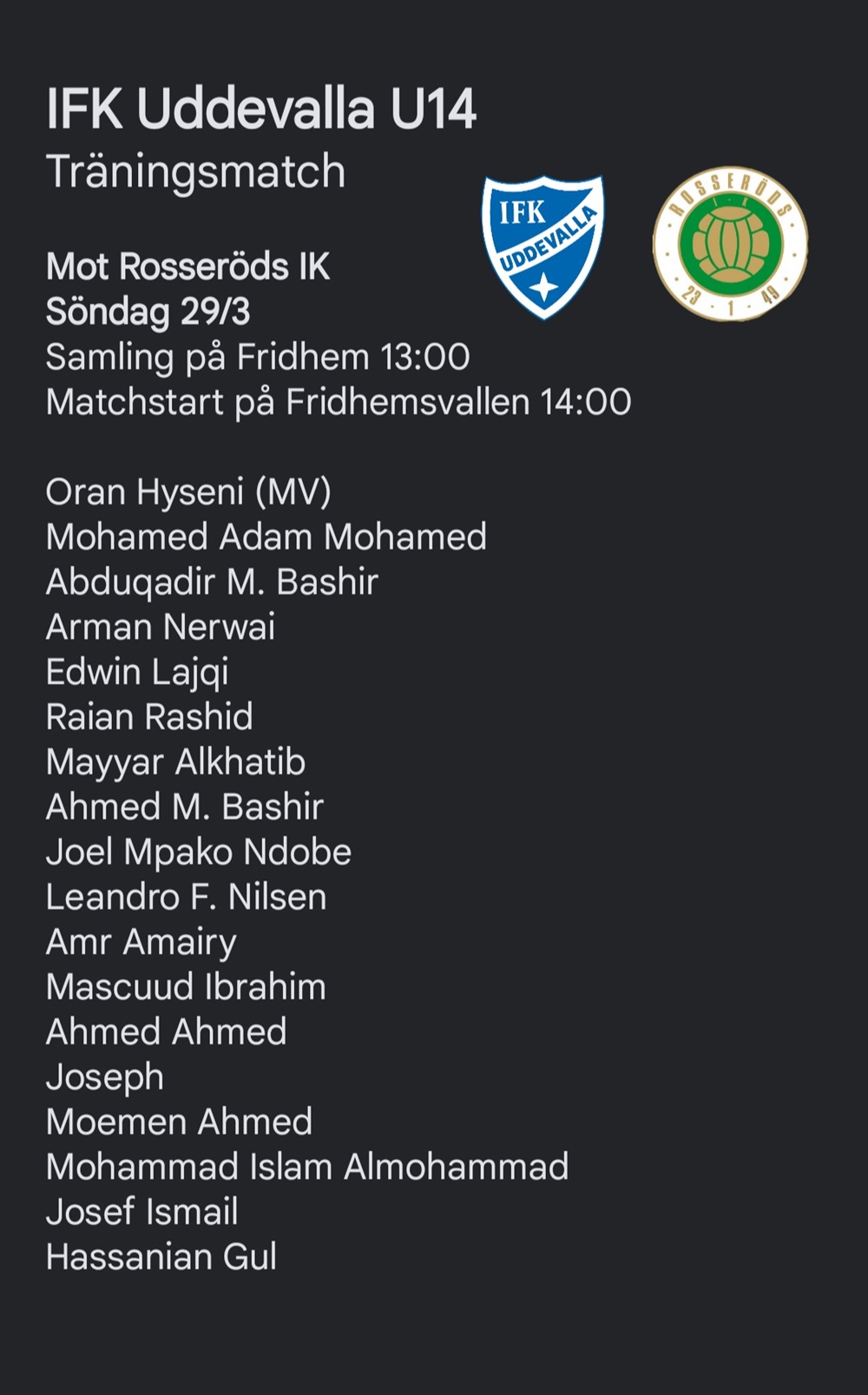 På söndag 29/3 är det träningsmatch mot Rosseröds IK på Fridhemsvallen. Samling 13:00 och matchen startar 14:00.